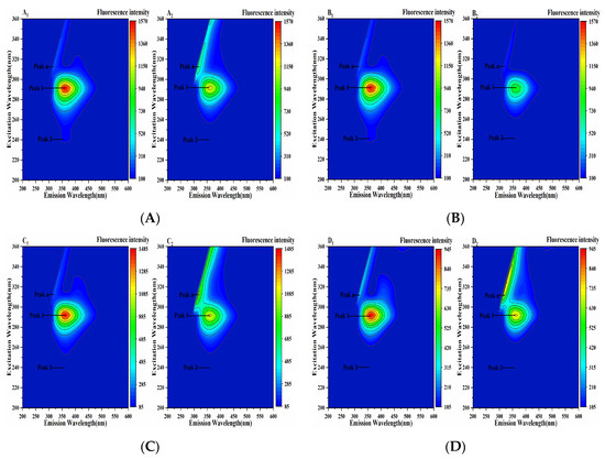 Three-dimensional fluorescence spectrum of the interaction between (A) THPP (B) TCPP (C) TAPP (D) Cu-TCPP and PL c(THPP) = 3.68 μM; c(TCPP) = 6.32 μM; c(TAPP) = 7.41 μM; c(Cu-TCPP) = 11.73 μM. (A1–D1) respective PL. (A2–D2) respective PL-porphyrin compound complex.