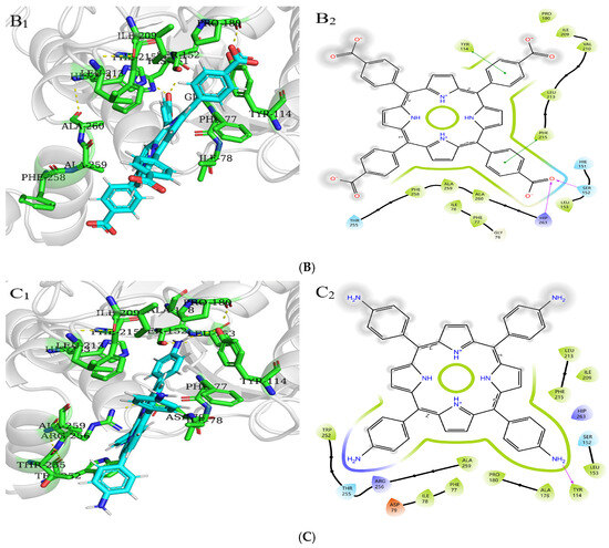 Molecular docking of (A) THPP (B) TCPP (C) TAPP to PL. (A1–C1) respective predicted best binding mode. (A2–C2) respective 2D diagram.