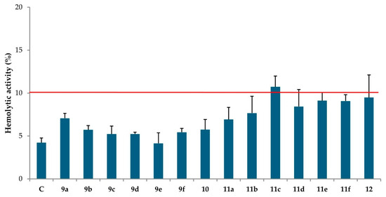 Hemolytic activity (%) of novel compounds at the concentration of 0.01 mg/mL (mean values ± standard deviation, n = 9) after 60 min at 37 °C. C: control, PBS buffer. 9a–10: hybrid uracil-caffeine derivatives; 11a–12: hybrid uracil–gramine derivatives. The red line indicates the hemolysis threshold of 10%.