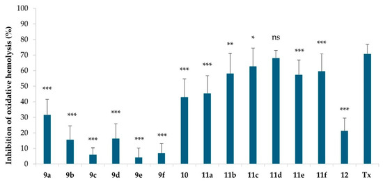 Cytoprotective activity of novel compounds and the standard antioxidant Trolox (Tx) at the concentration of 0.01 mg/mL under oxidative stress conditions (60 mM AAPH, 240 min, 37 °C). 9a–10: hybrid uracil–caffeine derivatives, 11a–12: hybrid uracil–gramine derivatives. The results are presented as the mean value ± standard deviation (n = 9) in comparison with Tx activity (* p < 0.05, ** p < 0.01, *** p < 0.001). Non-statistically significant difference is indicated as ns.