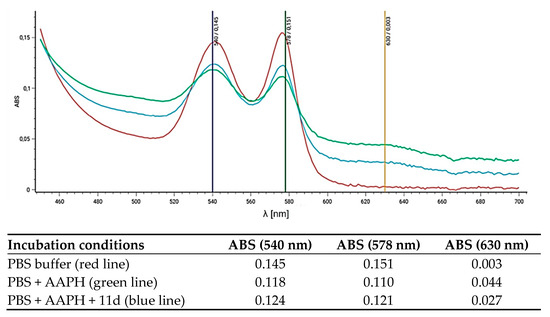 Spectral scans (450–700 nm) of hemoglobin after 4 h of incubation of RBCs in the following: PBS (red line); in PBS with 60 mM of AAPH (green line); PBS with 60 mM of AAPH and derivative 11d (0.01 mg/mL). Absorbance values (ABS) at 540 nm and 578 nm (oxy-Hb peaks) and 630 nm (MetHb peak) are provided for each scan in the accompanying table. Representative data from a series of experiments are shown.