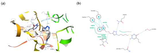 (a) The depiction of possible hydrogen bond formation between 11d and 1N5X protein domain. (b) The 2D depiction of interactions between 11d and the 1N5X protein domain. Blue dashed lines—hydrogen bonds, cyan lines with big dots—pi–pi interactions, and green solid lines—hydrophobic contacts.