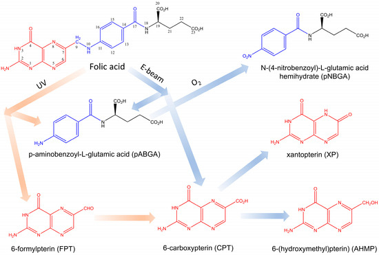 - Araújo, M.M.; Marchioni, E.; Zhao, M.; Kuntz, F.; Di Pascoli, T.; Villavicencio, A.L.C.H.; Bergaentzle, M. LC/MS/MS Identification of Some Folic Acid Degradation Products after E-Beam Irradiation. Radiat. Phys. Chem. 2012, 81, 1166–1169. [Google Scholar] [CrossRef]