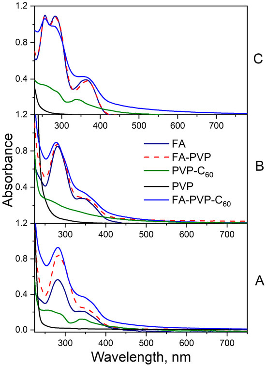 Absorption spectra of the FA-PVP-C60 conjugate, intermediate synthesis products FA-PVP, PVP-C60, PVP, and FA at pH 4.5 (A), pH 7.2 (B) and pH 10.7 (C).
