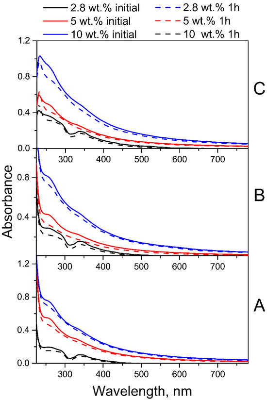 As FA has absorption maxima in both UVA and UVB spectral regions, two lamps with ranges of 300–400 nm (λmax = 350 nm) and 205–315 nm (λmax = 254 nm) were used simultaneously for photolysis. The photostability of fullerene in intermediate PVP-C60 conjugates was preliminarily estimated under UV irradiation conditions in the same spectral range for 1 h. The absorption spectra (Figure 3) before and after 1 h of UV irradiation confirmed the photostability of fullerene C60 in the intermediate PVP-C60 conjugates with fullerene content from 2.8 to 10 wt.% at different pH of aqueous solutions.