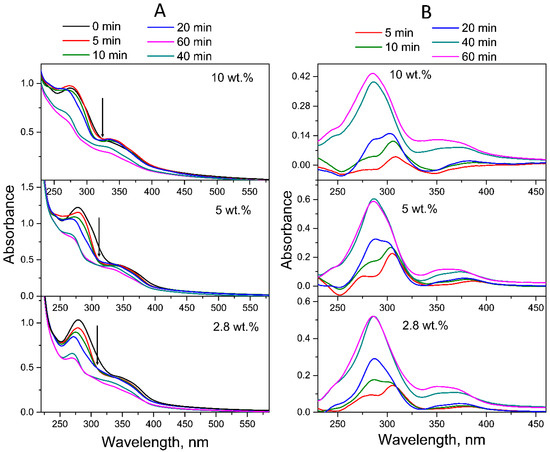 Figure 4 shows the time evolution of the UV–Vis absorption spectra of FA-PVP-C60 conjugates with different fullerene contents in neutral aqueous solutions (pH 7.2). As can be seen from Figure 4A, with increasing UV irradiation time, the absorption of the band at 280 nm gradually decreased, while the absorption of the band at 350 nm gradually increased. This behavior causes the appearance of an isosbestic point at 311 nm, which indicates the formation of FA photodegradation products [55]. Upon UV irradiation, in addition to a decrease in absorption, the absorption maxima of FA underwent a blue shift: from 284 and 350 nm, the bands shifted to 272 and 342 nm, respectively. Moreover, the decrease in absorption was more pronounced for the band at 284 nm, corresponding to the pABGA fragment. It is known that FA absorbs approximately 3.8 times stronger at 280 nm than at 350 nm [27].