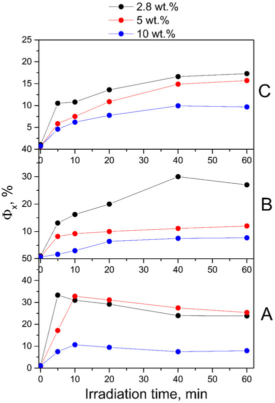 To qualitatively represent the influence of fullerene C60 on the process of photodegradation of FA in the conjugates, experimental difference (ED) spectra were obtained by subtracting the spectra of conjugates irradiated for 5–60 min from their native spectra. As can be seen in Figure 4B, the ED spectrum of the all-FA-PVP-C60 conjugates neutral solution irradiated for 5 min contains maxima at 278, 310 and 365 nm, characteristic of FPT [56]. Then, after 20 min of irradiation, the ED spectrum of the conjugate with 2.8 wt.% fullerene contained maxima at 290 and 350 nm, characteristic of CPT [57], which has a lower quantum yield (QY) of photodegradation compared to FA and FPT. Thus, the third stage of FA photodegradation, oxidation of FPT to CPT, began after 10 min of irradiation of the FA-PVP-C60 conjugate containing 2.8 wt.% of fullerene. Also, the ED spectra of FA-PVP-C60 conjugates (2.8 wt.%) irradiated for 40 and 60 min were virtually identical, indicating that by 40 min of irradiation, virtually all FA had degraded. With increasing concentration of the fullerene in the conjugate, it can be noted that the FPT oxidation stage began later.