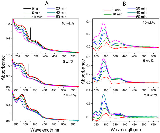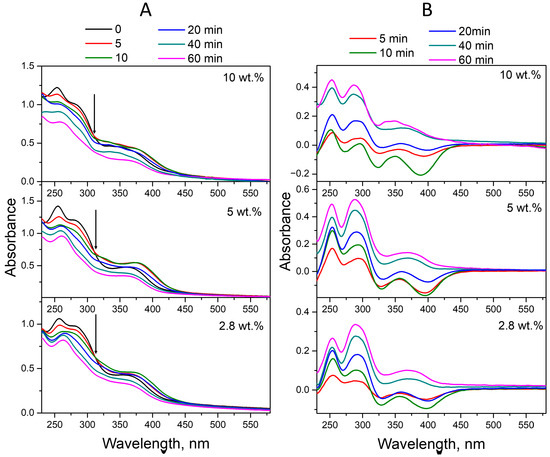 As in the neutral environment, in this case, the changes were more pronounced for the band at 282 nm, responsible for the absorption of FA fragments—both pABGA and PT. The spectrum of FPT in its acidic form had an absorption band centered at 310 nm, and the band centered at approximately 350 nm had a higher relative intensity than that of PT and CPT in both acidic and alkaline media [57]. Moreover, in an acidic environment, the differences in the rate of photodegradation were more pronounced: the ED spectra (Figure 6B) show an increase in the difference between the spectra at 40 and 60 min of irradiation with an increase in the fullerene content in the conjugate. The ED spectra of the conjugate with a fullerene content of 2.8 wt.%, corresponding to 5 and 10 min of irradiation (Figure 6B), contain characteristics of FPT maxima. The ED spectrum of the same conjugate, corresponding to 20 min of irradiation, contains characteristics of CPT maxima. At the same time, on the ED spectra of conjugates with a fullerene content of 5 and 10 wt.%, corresponding to both 20 and 40 min of irradiation and responsible for the absorption of FPT, the shoulder at 310 nm can be noted. This indicates a protective effect of fullerenes on FA under UV irradiation.