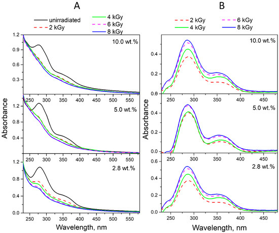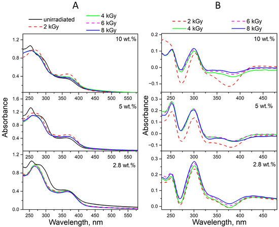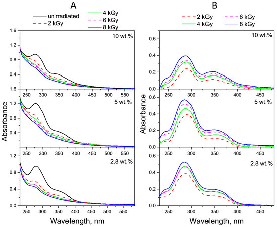 The ED spectra obtained by subtracting the spectra of conjugates irradiated with doses of 2–8 kGy in neutral (Figure 8B) and acidic media (Figure 9B) from the spectra of non-irradiated conjugates show that the absorption maxima of the product decreasing during radiolysis are at 290 and 350 nm, which corresponds to the CPT.