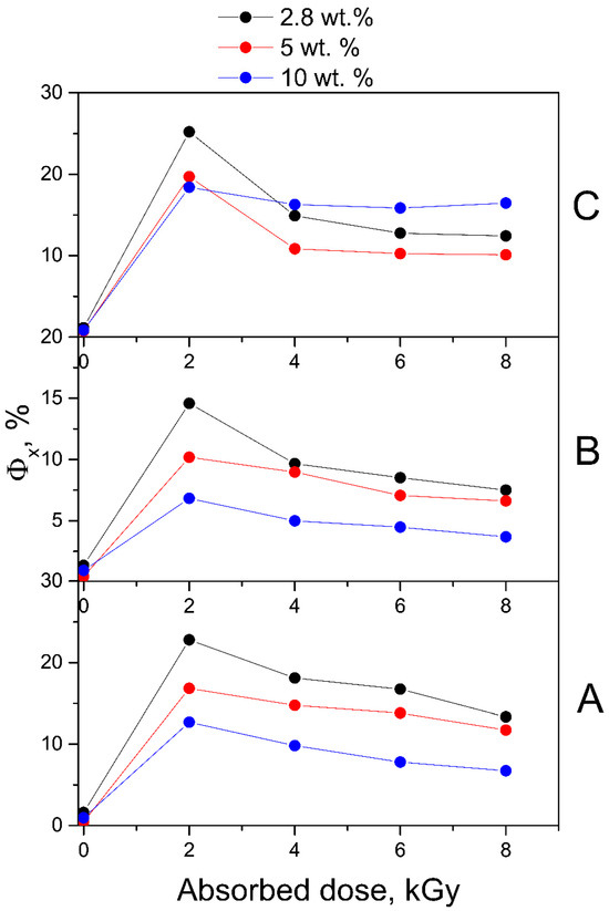 Fluorescence QYs (Φx) of air-equilibrated aqueous solutions of non-irradiated and irradiated with doses of 2–8 kGy FA-PVP-C60 conjugates at pH 4.5 (A), pH 7.2 (B) and pH 10.7 (C).