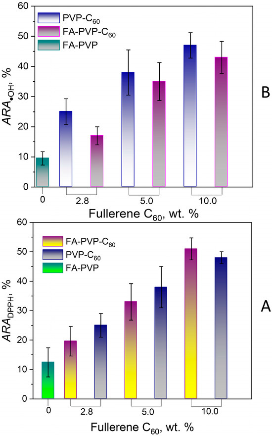 To confirm this conclusion, we assessed the ability of the FA-PVP-C60 and intermediate FA-PVP and C60-PVP conjugates to scavenge the model free radical DPPH, as well as the hydroxyl radical. Figure 12 shows the dependence of the conjugate’s radical scavenging ability on the fullerene content in the conjugate. The antiradical activity (ARA) of the conjugates increased with increasing fullerene content. The ARA values of the PVP-C60 intermediate conjugates turned out to be comparable with that of the FA-PVP-C60 conjugates (Figure 12A,B). Despite the fact that FA is known for its antioxidant properties [63], the intermediate conjugate FA-PVP demonstrated only moderate ARA against DPPH (Figure 12A) and hydroxyl radicals (Figure 12B). At the same time, we did not observe the ARA of the conjugate FA-PVP-C60 equal to the sum of the intermediate conjugates ARA. Probably, the ARA of the conjugates also depends on the accessibility of the reaction centers involved in the scavenging of free radicals. Hydrophobic interactions of poorly soluble components of the conjugate (fullerene and FA) can lead to less accessibility of these molecules for free radicals.