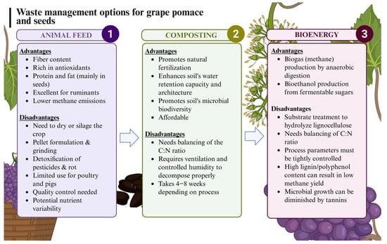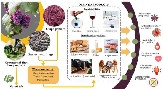 Grape (Vitis vinifera L.) is one of the most extensively grown fruits in temperate climates, with more than 72 Mt of grapes produced in 2023, out of which more than 27 Mt of wine were produced globally, as estimated by the Food and Agriculture Organization [1]. Winemaking is indeed one of the oldest practices in human history, and wine itself is an intrinsic component of many cultures, especially in Mediterranean countries. In fact, European countries account for more than 60% of the world’s wine production, with Italy, France, and Spain being the top 3 producers globally. In Europe, 22.6 Mt of grapes were harvested, with 20.7 Mt being harvested for wine production only [2]. This great production of wine is paired with a similarly great volume of waste, as it is estimated that 20–30% of the grape weight input in winemaking ends up as grape pomace (GP), depending on the winemaking techniques and grape varieties, which includes grape skins (GSk), which can make up around 13–17% of the solid waste fraction, while seeds (GSd) account for 38–52% [3,4,5]. Additionally, a great mass of grape stems (GSt) are generated from grapevine pruning and management, representing approximately 2.5–7.5% of the total waste mass [6]. These facts have led to substantial research in the last decade revolving around grape waste management and revalorization strategies, often approached from a circular economy perspective in order to avoid landfilling. These winemaking by-products also contain high amounts of phenolic compounds, fibers, lipids, and colored pigments such as anthocyanins [7]. Despite its seasonality, GP and its individual components constitute a great mass of biomass waste, and various strategies have been developed to exploit it.
