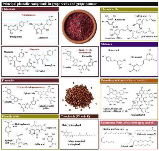 Chemical structure of whole grape pomace and grape seed major bioactive compounds.