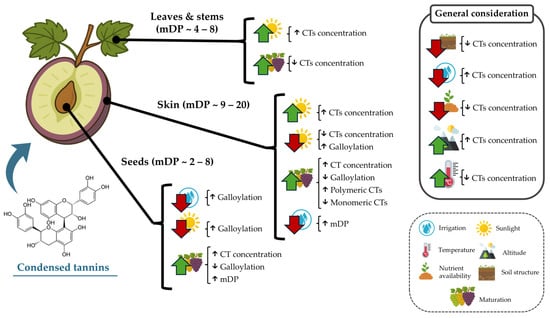 GSk, comprising approximately 5–10% of the total dry weight of the berry, typically contains significant concentrations of tannins [58]. However, the ratio of tannin to non-tannin phenolics varies among different grape cultivars, with flavonols and phenolic acids being the most prominent polyphenols present [46,50]. The major difference between red and white cultivars is that while red varieties present anthocyanins in their GSk, white grape cultivars usually show higher levels of non-colored polyphenols, especially phenolic acids, CTs, and also flavonols [59]. This is known to occur due to a lower flavan-3-ol synthesis by key enzymes such as leucoanthocyanidin reductase and anthocyanin reductase in favor of anthocyanin synthesis as the grape berry matures [45]. This also explains why these differences in CTs and other polyphenol contents between red and white varieties may not be so apparent in GSd, which usually displays more homogeneous levels of CTs among varieties [59]. The average concentration of tannins in the GSk is usually around 2 to 4 mg/g dw (Table 1). A wide study assessing the tannin content of 36 grape varieties by different methods available determined that the mean concentration of CTs in GSk could be around 4 mg/g fresh weight (fw), with the lowest values observed in the Malbec cultivar (1.7 mg/g fw) and the highest in table grape cultivars such as the Red Emperor cultivar (7.1 mg/g fw) [50]. Other reports indicate higher concentrations, up to 25 mg/g GSk in Cabernet Sauvignon, but this may be biased due to the CTs quantification method [60]. GSk are usually those of the highest mDP in all of the grape fractions, with variations between 8 and more than 20 monomers (Table 1). CTs in GSk usually present an mDP of around 8 to 9, with some exceptions (Table 1), and primarily include (+)-catechin, (−)-epicatechin, gallocatechin, and epigallocatechin, as well as oligomers of procyanidins and prodelphinidins [49,61]. In terms of composition, the main terminal monomer of GSk’s CTs is generally (+)-catechin, and (−)-epicatechin is the main extension subunit [62]. The proportions of each of these monomers have a strong varietal effect, with Cabernet Sauvignon, Merlot, and Syrah varieties standing out, for example, due to their high prodelphinidin content, more usual in these red varieties, as it is a precursor of anthocyanins [63]. Regardless of the variety analyzed, in most cases, these CTs are bound to other types of compounds, primarily polysaccharides, lipids, and proteins. This conformation means that tannins extracted from GSk have a chemical structure with a greater degree of branching and, therefore, a higher mw than tannins extracted from other parts of the vine [64]. These structures are modified during the grape ripening process, during which the degree of tannin polymerization increases [60]. This increased polymerization affects sensory analysis because it prevents these tannins from binding with salivary proteins, thereby reducing the level of astringency, which decreases with greater structural complexity of the CTs [65]. It has been observed that during grape ripening, the total amount of CTs varies significantly, reaching its highest levels around the time of veraison, with a subsequent decrease in their content afterward [66]. This decrease is attributed to enzymatic oxidation processes occurring after veraison.