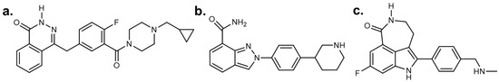 Structures of (a) olaparib (OLP), (b) niraparib, and (c) rucaparib.