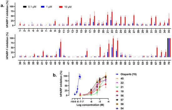 Fast screening to detect the inhibitory impact of the selected compounds on hPARP-1′s catalytic activity using the hPARP-1 enzyme assay. (a) Compounds were tested at two different concentrations (1 and 10 µM) to determine the most active hits. OLP (compound 70) was additionally applied at a concentration of 0.1 µM as a positive control. (b) Dose–response curves determining the IC50 values of the most active compounds. Results are presented as the mean ± standard deviation calculated based on two biological replicates, each comprising three technical replicates.