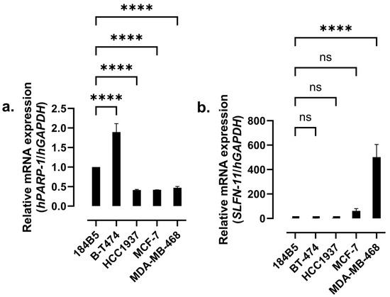 mRNA expression levels of (a) hPARP-1 and (b) SLFN-11, as determined in the breast cell lines under investigation using RT-qPCR. The expression levels were calculated following the ΔΔCt methodology in relation to the expression of the housekeeping gene hGAPDH and were normalized for illustration to the corresponding expression levels in 184B5 healthy breast cells. **** p-value < 0.001; ns, not-significant difference.