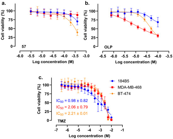Cell viability dose–response curves of the breast cell lines under investigation upon 72 h treatment with (a) compound 57, (b) OLP, and (c) TMZ. Cell viability was determined using CV assay. Results are presented as the mean ± standard deviation calculated based on two biological replicates, each comprising three technical replicates.