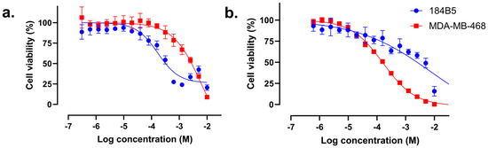 In vitro dose–response curves of 184B5 healthy breast and MDA-MB-468 breast cancer cells. The cells were treated for 72 h with several concentrations of TMZ combined with IC10 of (a) compound 57 and (b) OLP. Cell viability was determined using CV assay. Results are presented as the mean ± standard deviation calculated based on two biological replicates, each comprising three technical replicates.