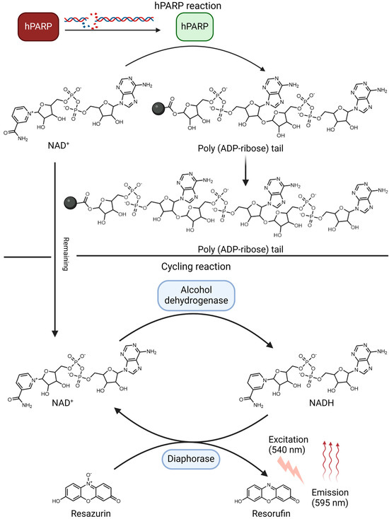 The concept of the modified hPARP-1 enzyme assay. The assay version presented in this paper consists of a hPARP enzyme reaction and a cycling reaction. In the hPARP reaction, the hPARP enzyme is activated in the presence of activated, i.e., strand breaks-containing DNA and uses the NAD+ substrate to add poly(ADP-ribose) tails as posttranslational modification to itself. In the second step, the cycling reaction allows a catalytically amplified fluorescent read-out of the remaining NAD+ substrate that, in case of successful hPARPi treatment, is not used up when hPARP is inhibited. NAD+ is transformed to NADH+H+, which is used to reduce resazurin to resorufin (excitation/emission: 540/595) the fluorescence of which serves as final assay read-out and indirectly indicates the activity of the hPARP enzyme. The scheme was created with BioRender.com.