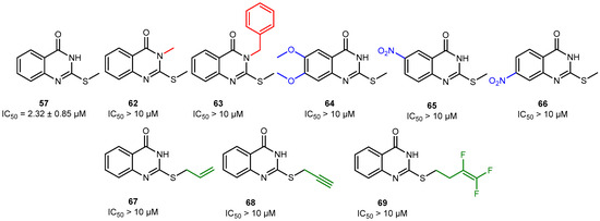 Compound 57 (2-(methylthio)quinazolin-4(3H)-one) was found to be the most active hPARPi, with an IC50 of 2.3 µM against hPARP-1. Accordingly, the binding of compound 57 to the ART subdomain of hPARP-1 was studied by in silico molecular modeling and it was found exhibiting the interactions that were previously claimed to be essential for the activity of hPARPi, as shown in Figure S3 (cf. also Figure 2). These are the hydrophobic interactions with Tyr907 and H-bonds with Ser904 and Gly863. Concerning the structure–activity relationship (SAR, cf. Figure 10, Figure 11 and Figure 12), several features were identified to be essential for its activity as a hPARPi. By comparing compound 57 with compounds 62 and 63, it was noticed that any substitution at the nitrogen position 3 (Figure 10; red part of the structures) led to a complete abolishment of hPARP-1 inhibitor activity. The rationale behind this observation is that the replaced hydrogen atom seems to be essential for the formation of an H-bond with the oxygen group of the glycine at position 863 of hPARP-1, as described in the literature [37]. Moreover, the modifications at meta or para positions in the compounds 64, 65, and 66 (Figure 10; blue parts of the structures) lead to a dramatic decrease in activity as it disturbs the crucial hydrophobic interaction that has to be formed with the tyrosine residue of the ART subdomain [28]. A modification at the thiomethyl group of compound 57, as realized in compounds 67, 68, and 69 (Figure 10, green part of the structures), does not lead to complete loss of the compounds’ activity; however, it causes a reduction in the PARPi activity by at least four-fold. Compound 57 (IC50 = 2.3 µM) also showed a 2.5-fold higher hPARP-1-inhibiting activity compared to its core structure quinazolin-4(3H)-one shown in Figure 11 (IC50 = 5.8 µM), lacking the thiomethyl group [38,39].