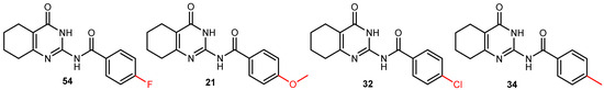 Besides the compound 57 scaffold, another new core structure (4-methyl-N-(4-oxo-3,4,5,6,7,8-hexahydroquinazolin-2-yl)benzamide) was identified to exhibit hPARP inhibitory activity. Based on the available compounds, several modifications were identified that strongly affect its activity. The most active compound sharing that core structure was compound 54 (IC50 = 4.56 µM, see Figure 12) with a fluoride group at the para position of the phenyl group. However, the replacement of the fluoride group by either the methoxy, methyl, or chloride group, as realized in the compounds 21, 32, and 34 (Figure 12; red part of the structures) causes a decline in the compounds’ PARPi activity by at least three-fold. The high activity of this family of compounds could be related to the presence of an additional benzamide group attached to the core structure of the aforementioned compound 57 family in which the aromatic group may form a π–π interaction with Tyr896 similar to that formed by the benzyl group in the case of OLP as shown in Figure 2 [40].