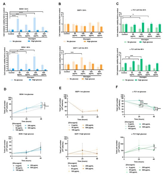 Regarding cell proliferation, BON-1 cells exhibited a significant increase in proliferation at concentrations of 100 pg/mL and 500 pg/mL of glucagon under glucose-deprived conditions, while no significant changes were observed in high-glucose conditions (Figure 2D). In QGP-1 cells, no significant differences between culture conditions were observed independent of glucose presence or absence. However, glucose-deprivation induced a decreased proliferation rate over time across all conditions, independent of glucagon concentration, at either 24 or 48 h (Figure 2E). In α-TC1 cells, a trend to a time-dependent increase in proliferation was observed for all concentrations of glucagon in the presence of glucose, being significant at 250 pg/mL of glucagon. In the absence of glucose, a significant decrease in cell proliferation was observed over time (Figure 2F).