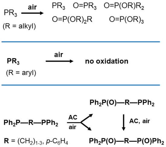The exposure of dissolved or neat alkylphosphines to air leads to various side products (top), while triarylphosphines cannot be oxidized with air (middle) [22,43,46]. Adsorbing bisphosphines with diverse spacers R on activated carbon (AC) prior to air exposure results in monoxides as intermediates and dioxides as final products (bottom).