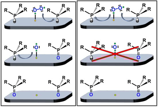 Selective oxidation of a monophosphine with air after adsorption on AC [22]. Consecutive (left) versus simultaneous (right) consumption of the O2 that would exclude an activated oxygen atom residing on the surface (red cross), cannot be distinguished.