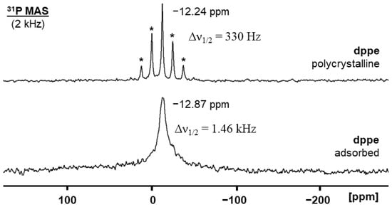 When the representative bisphosphine dppe is adsorbed on the AC surface under an inert atmosphere, the 31P solid-state NMR characteristics change (Figure 4). Polycrystalline dppe shows an isotropic line at –12.34 ppm, and at a spinning speed of 2 kHz, several sets of rotational sidebands that reflect the CSA (Chemical Shift Anisotropy) [23,24,51] of the signal. In the crystal, the surroundings of the phosphorus nuclei are well-defined, and the residual halfwidth of the isotropic line is only 330 Hz. In principle, there could be two isotropic lines; however, due to the arrangement of the molecules in the unit cell, the chemical shift difference does not lead to resolved signals [52,53].