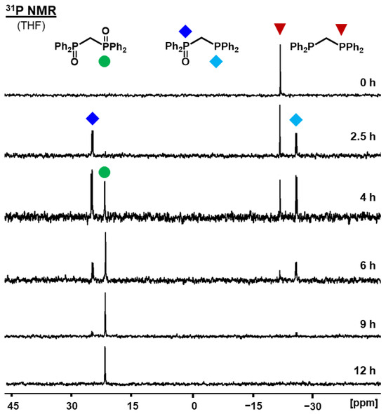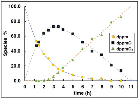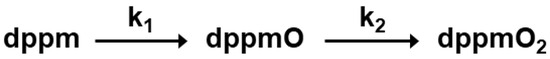 Using dppm as the example, the kinetics of the oxidation reaction could be studied in more detail (Figure 15). For this purpose, the signals of all species in the 31P NMR spectra (Figure 8) were integrated, and the conversion rates were calculated. The graphical displays obtained are shown for the oxidation of dppm (Figure 16). The oxidation of dppm proceeds in a stepwise manner with two different rate constants, k1 and k2 (Figure 15). First, the formation of dppmO occurs at a rate of 0.51 s−1 and after an induction period of 2.44 h dppmO2 starts to appear (k2 = 11.8 M·s−1) (Figure 16).