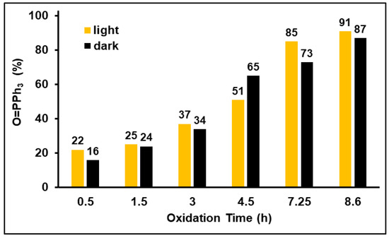 Therefore, we tested the impact of light on the oxidation of phosphines adsorbed on AC. The results we obtained indicate that light has no effect on the oxidation of phosphines on the AC surface. As Figure 11 and Figure S11 show, the oxidation of PPh3 proceeds practically at the same rate as the control batch exposed to air in the dark.