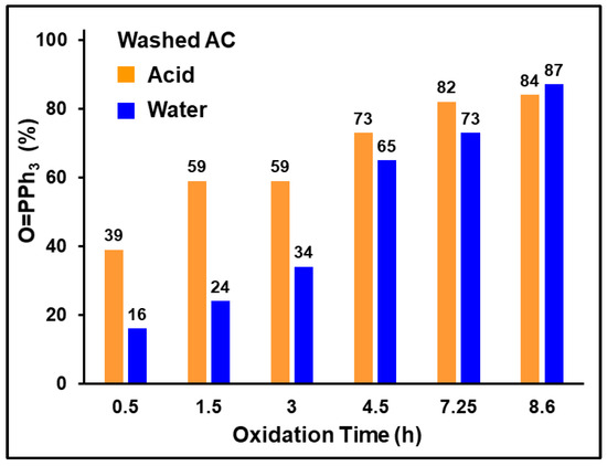 AC is produced from different sources like wood, walnut or almond shells, and coal [7,8,9,62,63,64,65]. We reported earlier that AC contains phosphates due to the use of phosphoric acid in the production of AC [22,64]. While we could previously demonstrate that phosphates do not play a role in the AC-assisted oxidation of phosphines, they produce a 31P NMR background signal at 3 ppm [22]. In order to remove this resonance from the spectra of samples containing AC, the AC is vigorously washed with deionized water and thoroughly dried in vacuo before use [22]. Besides phosphates, other impurities in AC samples like traces of metals could be present that might catalyze the oxidation of phosphines on the surface [63,65]. While it has been shown earlier that most pure metal complexes do not catalyze the oxidation of phosphines [22], on the AC surface, this might be possible. Therefore, we washed the AC sample with an acid to remove any metal impurities on its surface.