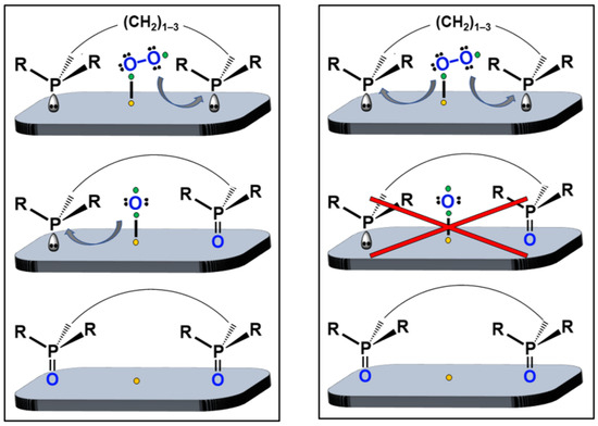As described in the Introduction section above, the previously reported surface-assisted oxidation of monophosphines described the indirect correlation of the surface coverage with the reaction rate [22]. Additionally, a steric influence and the need for surface-adsorbed O2 has been suggested [22]. Furthermore, delocalized unpaired electrons that reside in the aromatic ring systems on the surface of AC play a crucial role in the activation of the adsorbed O2 molecule [66,68]. Unfortunately, the AC surface is highly complex, and the way in which oxygen interacts with the surface is a matter of debate [69,70]. For example, the side-on versus end-on adsorption of the O2 molecule on graphitic materials has been investigated [69], as well as the need for defects on the surface [70]. The role of carbon sites at the edges of the aromatic systems and the formation of peroxo species on the AC surface have been studied as well [71]. Due to the complexity of the topic, we cannot claim that O2 is adsorbed in the end-on mode, as depicted in Figure 14. However, this detail is not relevant for the information we sought. Our focus was the key question of whether the O2 molecule is taken up in a concerted action by two phosphines in bis- and trisphosphines or in a stepwise manner, which may leave one oxygen atom as an intermediate on the AC surface. The latter could potentially be used for oxidizing other co-adsorbed species.