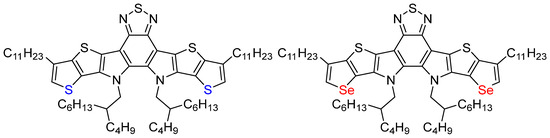 Y6 and its derivatives with the A-DA’D-A structure have dominated as a star SMA in the field of OPVs since 2019 [12]. However, despite their remarkable optoelectronic properties demonstration in organic photovoltaic (OPV) devices, the nonlinear optical (NLO) characteristics of Y6 have not yet been systematically explored to date. Relevant research is urgently needed. In order to avoid strong absorption in the whole visible region, only the fused-ring DA’D core unit of Y6, 12,13-bis (2-butyloctyl)-3,9-diundecyl-12,13-dihydro-[1,2,5] thiadiazolo [3,4-e] thieno [2″,3″:4′,5′] thieno [2′,3′:4,5] pyrrolo [3,2-g] thieno [2′,3′:4,5] thieno [3,2-b] indole (BDS), was chosen to be the target instead of Y6 itself. In addition, two sulfur atoms in BDS are replaced with two selenium atoms to form BDSe, in which the two selenophenes are expected to enhance the nonlinear optical responses further (Figure 1). Firstly, the atomic radius of Se is larger than that of S, which causes the outer electrons of Se to be more spread out in space, resulting in a lower electron density [13]. Moreover, selenophene shows enhanced quinoidal character and weakened aromaticity because of the better orbital overlap in the π-conjugated systems and the more delocalized electron cloud [14]. Moreover, selenophene-fused SMAs exhibit significantly broadened absorption and a slightly down-shifted lowest unoccupied molecular orbital (LUMO) energy level. The stronger intermolecular interaction and higher electron mobility in selenophene-fused SMAs should also favor an enhancement in NLO properties [15].