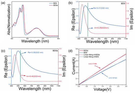 It has been verified that the polarization capabilities and electronic mobility of organic molecules are more favorable for enhancing NLO response. Both an ellipsometer and a space-charge-limited current (SCLC) were used on BDSe and BDS to determine their dielectric constants, which reflects the material’s polarization ability and electronic mobility [18,19]. The variation curves of dielectric constant as a function of wavelength (400–1100 nm) of BDSe and BDS are shown in Figure 2b,c, consisting of two components: The real part (Re) and the imaginary part (Im). The real part (Re) represents the relative dielectric constant of the material, describing its polarization ability. The curve of imaginary part (Im) closely resembles that of the UV-vis absorption spectrum. Considering the Z-scan measurements of nonlinear optical properties were conducted at 532 nm, the permittivity value at this wavelength is explicitly annotated in the figure. The Re values (blue solid curves) for BDS and BDSe are 3.21 and 3.35, respectively, while the Im values (red dotted lines) are 0.29 and 0.40, respectively. The results demonstrate that BDSe exhibits enhanced polarization response compared to BDS at the Z-scan measurement wavelength. In the J-V curves of BDS and BDSe, shown in Figure 2d, where the solid lines represent the linear fitting results, the slope (k) for BDS and BDSe is measured to be 0.14142 and 0.17168, respectively. The electronic mobility (μ) can be calculated using the following formula: