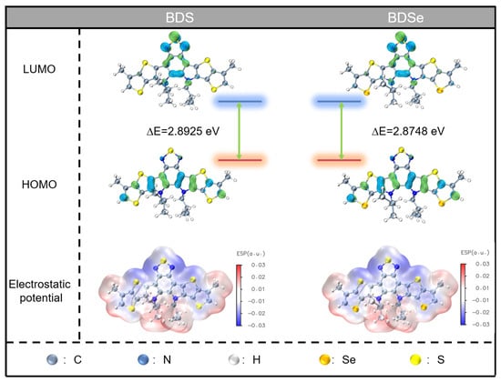 Density functional theory (DFT) calculations at the CAM-B3LYP/6-31G(d) level were conducted to investigate the frontier molecular orbital distributions of BDS and BDSe in toluene solution [20,21]. To simplify the computational model while maintaining chemical accuracy, the long alkyl chains in the molecular structures were replaced with methyl groups based on preliminary assessments, which showed that the side chains had negligible effects on the molecular conformation and electronic properties (see supporting Tables S2 and S3). As revealed in Figure 3, both compounds exhibit nearly identical molecular architectures and comparable frontier orbital distributions. The central 1,2,5-thiadiazole unit serves as an electron-accepting core, flanked by fused heterocyclic rings functioning as electron donors, collectively establishing a donor–acceptor–donor (D-A-D) structural motif. Theoretical analysis demonstrates similar electrostatic potential distributions between BDS and BDSe, although selenium substitution induces notable electronic effects. Replacing the sulfur atoms with selenium increases the calculated dipole moment from 6.0947 Debye (BDS) to 6.7975 Debye (BDSe). Concurrently, the theoretical band gap underwent a slight reduction from 2.8925 eV to 2.8748 eV following chalcogen substitution. This computational trend aligns with experimental observations from UV absorption spectroscopy, confirming the BDSe’s narrower band gap compared to BDS. The reduced band gap, combined with enhanced dipole moment, likely contributes to the improved nonlinear optical performance observed in BDSe derivatives, as narrower band gaps generally facilitate more efficient intramolecular charge transfer, a critical factor for nonlinear optical materials [22,23].