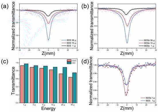 (a) Z-scan test results of BDS under different laser energies; (b) Zscan test results of BDSe under different laser energy; (c) comparison of Z-scan test results of BDS and BDSe under different laser energy; (d) Z-scan fitting results of BDS and BDSe under laser excitation with 1 μj of energy. The red, blue, and black circles in the figure represent the original test results at different energies, while the corresponding lines represent the fitting results.
