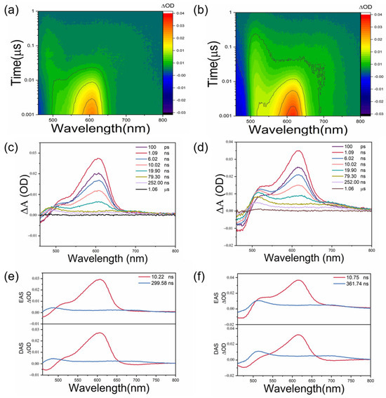 (a,b) Contour plot of ns-TA excited by BDS and BDSe at 430 nm; (c,d) selected TA spectra in contour plot corresponding to BDS and BDSe; (e,f) corresponding evolution-related spectra and decay-related spectra of BDS and BDSe.