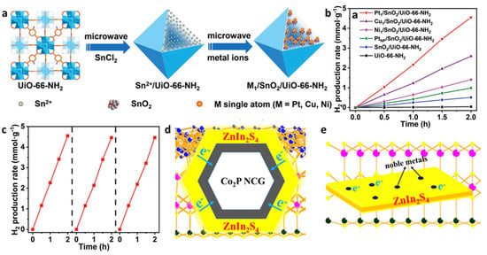 (a) Schematic illustration showing the microwave-assisted synthetic process for M1/SnO2/MOF. (b) Photocatalytic hydrogen production rates for Pt1/SnO2/UiO-66-NH2, Cu1/SnO2/UiO-66-NH2, Ni1/SnO2/UiO-66-NH2, PtNP/SnO2/UiO-66-NH2, SnO2/UiO-66-NH2, and UiO-66-NH2. (c) Performance in three consecutive runs of photocatalytic recycling for Pt1/SnO2/UiO-66-NH2, [32] Copyright 2021, Wiley. (d) The diffused electron separation over framework of Co2P/ZIS NCGs. (e) Limited active sites over noble metal loaded ZIS samples [33]. Copyright 2021, Elsevier.
