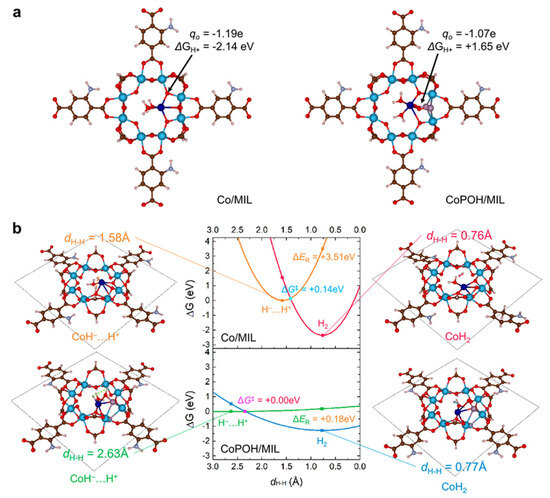 (a) Theoretical Gibbs free energy of protonation and the Marcus kinetics of Tafel processes of Co/MIL and CoPOH/MIL. Theoretically optimized MOF structures of Co/MIL and CoPOH/MIL. The numbers are the Bader charge of the oxygen atoms bonded to a Co atom and their proton binding free energies. (b) Gibbs free energy surfaces (ΔG in eV) of H2 bond formation in a Tafel process at Co/MIL and CoPOH/MIL based on Marcus kinetic theory of electron transfer [46]. Copyright 2024, American Chemical Society.