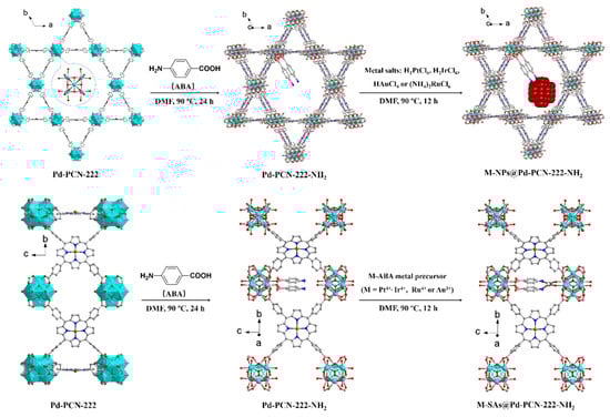 Schematic illustration showing the syntheses of M-NPs@Pd-PCN-222-NH2 with normal metal salt reduction and loading into the large pore-spaces (upper) and M-SAs@Pd-PCN-222-NH2 with the precoordination confinement strategy in the middle pore-spaces (lower) [47]. Copyright 2022, American Chemical Society.