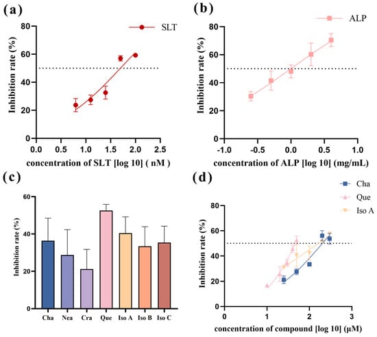 Nonlinear fitting curves for the actions of diverse compounds on HNE. (a) Nonlinear fitting curve for the action of sivelestat on HNE (SLT: sivelestat). (b) Nonlinear fitting curve for the action of Arctium lappa L. polyphenols on HNE (ALP: Arctium lappa L. polyphenols). (c) Bar graph of the inhibition rate of ALP single ingredients at a concentration of 50 μM. Cha: chlorogenic acid; Nea: neochlorogenic acid; Cra: cryptochlorogenic acid; Que: quercetin; Iso A: isochlorogenic acid A; Iso B: isochlorogenic acid B; Iso C: isochlorogenic acid C. (d) Nonlinear fitting curves of the effects of chlorogenic acid, quercetin, and isochlorogenic acid A on HNE (Cha: chlorogenic acid; Que: quercetin; Iso A: isochlorogenic acid A).