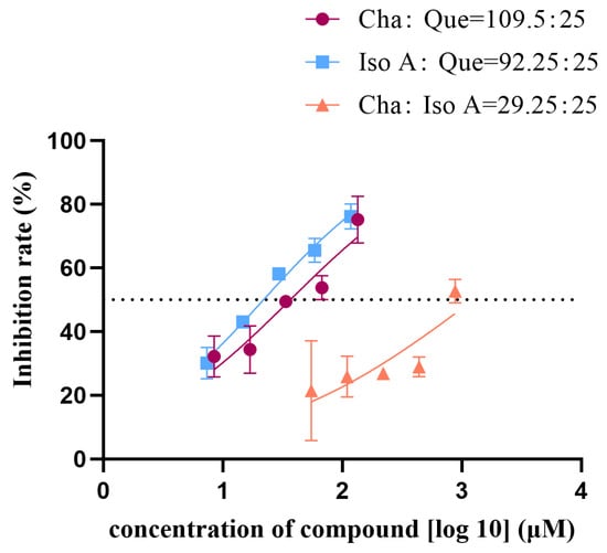 Based on the IC50 values of chlorogenic acid, quercetin, and isochlorogenic acid A, the concentration ratios for the combinations effect assay were set as follows: chlorogenic acid:isochlorogenic acid A = 29.25:25; chlorogenic acid:quercetin = 109.50:25; isochlorogenic acid A:quercetin = 92.25:25. Each group contained five concentration gradients. The results were plotted as nonlinear fitting curves (Figure 2), where the x-axis represents the total concentration of drug combinations. The calculated IC50 values were 1253, 36.58, and 21.82 μM, respectively. The average inhibitory effect of each combination was recorded with CompuSyn 1.2 software [30] for analysis to calculate the combination index (CI). CI > 1 indicates antagonism, CI = 1 indicates additive effects, and CI < 1 indicates synergism. As shown in Table 1, both the chlorogenic acid-quercetin group and the isochlorogenic acid A-quercetin group exhibited CI values < 1, suggesting synergistic effects across all five concentrations compared to those of the single constituents. In contrast, the chlorogenic acid-isochlorogenic acid A group showed CI values > 1, indicating antagonistic effects in all five concentrations. The isobolograms (Figure 3) showed the relationship between Fa (fraction affected, representing enzyme inhibition rate) and CI values. Specifically, Fa = 0.75 corresponds to 75% enzyme inhibition. For the chlorogenic acid-isochlorogenic acid A combination (Figure 3b), the data points exhibited a distinct distribution pattern in the upper-right quadrant relative to the additive line, suggesting antagonistic rather than synergistic or additive effects on HNE inhibition. This observed antagonism might stem from steric hindrance caused by their substantial molecular volumes and competitive binding behavior at overlapping or proximal sites on the target protein. In contrast, both the chlorogenic acid-quercetin (Figure 3a) and isochlorogenic acid A-quercetin (Figure 3c) combinations showed points clustered in the lower-left quadrant of the additive line, demonstrating a synergistic effect. This may result from quercetin’s relatively smaller molecular size, which allows it to interact with more than one binding site with limited spatial constraints when combined with either chlorogenic acid or isochlorogenic acid A, thereby achieving complementary advantages.