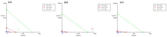 The isobolograms of combined effects on HNE. (a) Chlorogenic acid: quercetin (dose A: chlorogenic acid; dose B: quercetin). (b) Chlorogenic acid: isochlorogenic acid A (dose A: chlorogenic acid; dose B: isochlorogenic acid A). (c) Isochlorogenic acid A: quercetin (dose A: isochlorogenic acid A; dose B: quercetin). Combination data points on the diagonal line indicate an additive effect, while those on the lower left indicate synergism, and those on the upper right indicate antagonism (Fa: fraction affected).