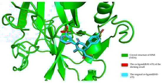 To validate the reliability of the docking model employed, we redocked the co-ligand (BAY-678) from the crystal structure (PDB ID: 5A0A) into the target HNE. The resulting binding mode from docking was compared with that in the original crystal structure, as illustrated in Figure 4. The docked conformation aligned well with the crystal structure conformation, exhibiting a root mean square deviation (RMSD) of 0.93 Å. Furthermore, BAY-678 exhibits an inhibition constant Ki = 15 nM against HNE [31]. According to the thermodynamic formula, ΔG= −RTlnKi (where R = 1.987 × 10−3 kcal × mol−1 × K−1 and T = 298 K), the theoretical binding free energy is calculated as −10.67 kcal/mol. Our molecular docking prediction yielded a binding free energy of −9.511 kcal/mol, demonstrating excellent agreement with the theoretical value. The close agreement between the docked and crystallographic poses (RMSD = 0.93 Å) and the minor deviation in binding free energy (predicted: −9.511 kcal/mol vs. theoretical: −10.67 kcal/mol) confirm the accuracy of the docking protocol. This supports the model’s applicability for subsequent docking studies.