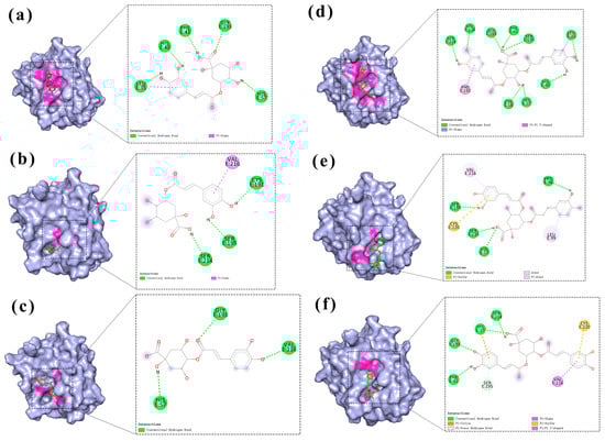 Binding mode of the effects of chlorogenic acid and its isochlorogenic acid isomers on the active site of HNE. (a) Chlorogenic acid. (b) Neochlorogenic acid. (c) Cryptochlorogenic acid. (d) Isochlorogenic acid A. (e) Isochlorogenic acid B. (f) Isochlorogenic acid C.