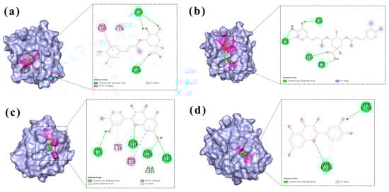 Diagram of the binding modes of chlorogenic acid, quercetin, and isochlorogenic acid A to the HNE at the binding sites of the whole protein, as well as the binding of quercetin to HNE at the active site. (a,b,d) Exploration of the binding sites of chlorogenic acid, quercetin, and isochlorogenic acid A to the entire protein of HNE. (c) The binding situation of quercetin at the original binding sites.