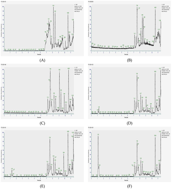 HPLC-ESI-MSn Chromatograms of Cochlospermum angolense extracts. (A) Acetone extract of the leaves; (B) Ethanolic extract of leaves; (C) Acetone extract of barks; (D) Ethanolic extract of barks; (E) Acetone extract of roots; (F) Ethanolic extract of roots.