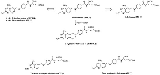 As part of a program to develop new MTX analogs, we were seeking to identify effective molecules that do not metabolize rapidly. Previous findings have demonstrated that the MTX analog bearing a 2,4-diaminoquinazoline instead of a 2,4-diaminopteridine moiety (such as 3, Figure 1) inhibits DHFR with the same binding affinity and presents slightly increased cytotoxic activity against cancer cells [15,16]. Moreover, two analogs of methotrexate containing either an ether or a thioether bond between the pteridine nucleus, and the benzoyl-glutamyl part instead of the N-methyl group (4 and 5, Figure 1), were shown to display strong anticancer activity in vitro and in vivo [17,18,19]. Regarding these analogs, the hydroxylation of position 7 of the pteridine nucleus was also observed in varying proportions using in vitro metabolism assays [20].